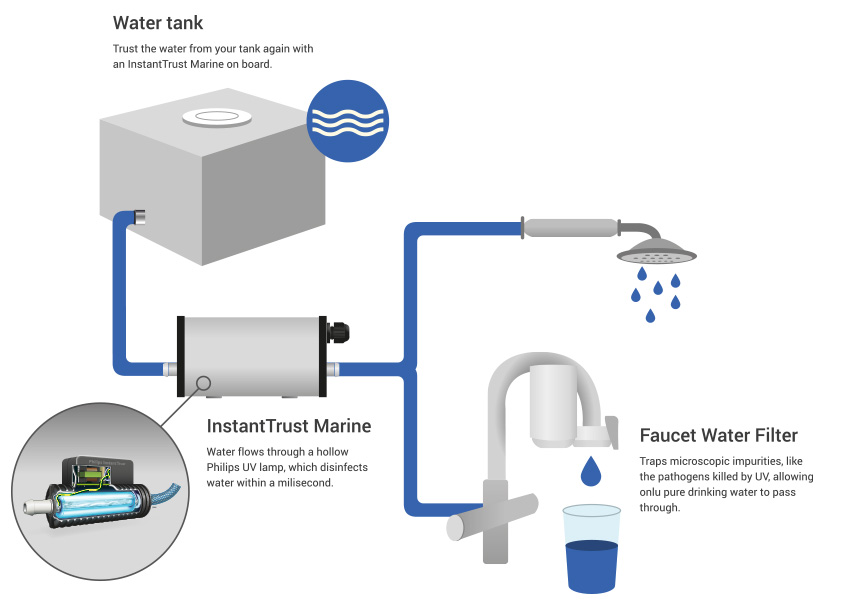 The InstantTrust Marine filters water coming from your drinking water tank. Your own water treatment device on board.