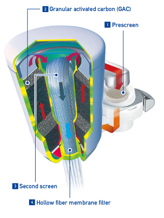 The 4-stage filtration 1 Prescreen 2 Granular activated carbon (GAC) 3 Second screen 4 Hollow fiber membrane filter |